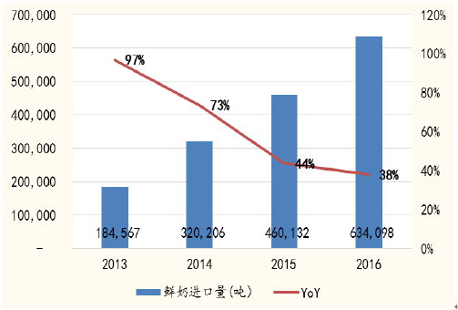 2016年共进口鲜奶63.4万吨,同比+37.8%,12月单月进口5.18万吨,同比-17.2%/环比-11.3%。2016年到岸平均价1.01美元/kg, 同比-4.2%。