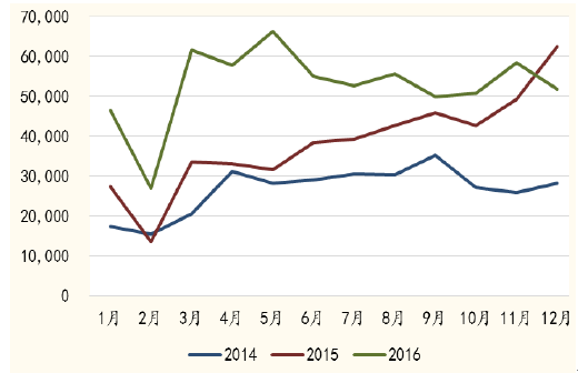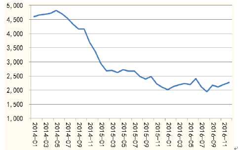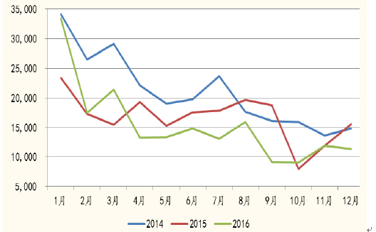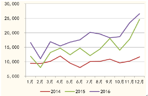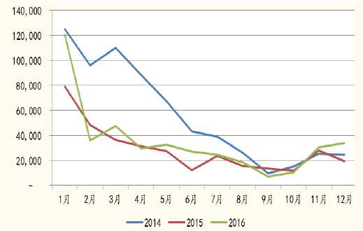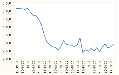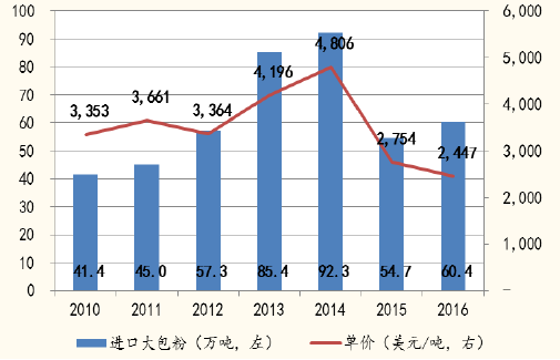 累计2016年共进口大包粉60.4万吨,同比+8.1%,到岸均价2,447美元/吨,同比-11.1%;其中全脂奶粉总共41.98万吨,同比+21%,到岸均价2,578美元/吨,同比-9.6%;脱脂奶粉总共18.4万吨,同比-7.9%,到岸均价2,149美元/吨,同比-16.8%。
