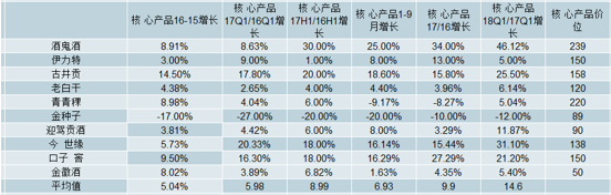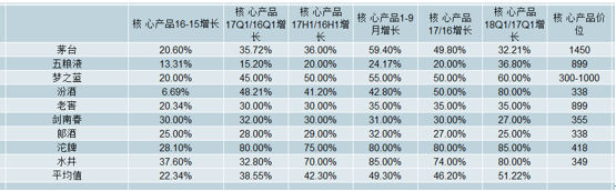 从各龙头公司选取 300 元以上白酒样本以及 300 元以下白酒样本,对其核心产品增长进行分析可以得到重要结论:高端及次高端白酒品类优势明显,增长提升快,从 16 至 18Q1的数据显示,平均增长在 22%以上,17Q1 到 18Q1 平均增长更是达到了最快的 51.22%;而中低端竞争激烈,整体增长速度远不如 300 元以上白酒,即便是 17Q1 至 18Q1 增长最快的阶段,平均增长也只有 14.60%