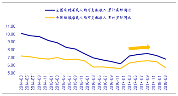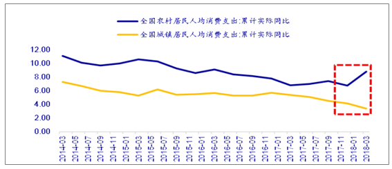 居民消费意愿提升,农村消费支出高于城镇。2017 年以来,国内消费者信心指数持续稳健提升,有力支撑消费的持续复苏。在精准扶贫、三四线城市棚户区改造等大背景下,居民可支配收入明显提升,相较于城镇居民,农村居民可支配收入、人均消费支出的提升速度均明显较快。