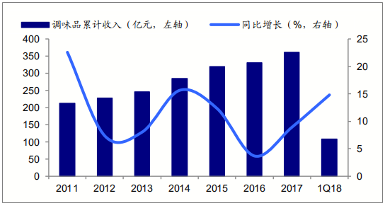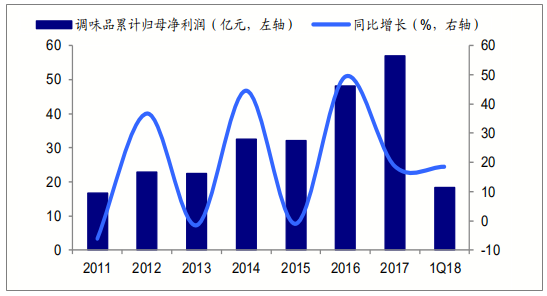 调味品行业增速在食品饮料各子行业中相对较快,景气度较高: 2017年酱醋调味品行业5家上市公司共实现营业收入225.8亿元,同比增长14.5%;归母净利润45.7亿元,同比增长26%;1Q18酱醋调味品行业5家上市公司共实现营业收入70.3亿元,同比增长14.6%;归母净利润16亿元,同比增长29.4%