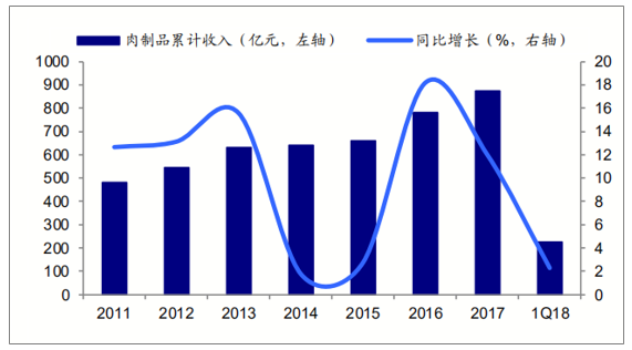 2017年肉制品行业7家上市公司共实现营业收入874.15亿元,同比增长12%,增速同比下降6.21pct。2018年1Q营业收入224.81亿元,同比增长2.3%,毛利率同比增长0.77pct