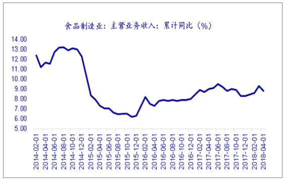 食品饮料行业需求普遍复苏。酒、饮料和精制茶制造业收入累计同比增速从 2016 年下半年开始提升,2017 年 6 月后有所回落,2018 年年初以来,收入同比增速从 7.7%迅速回升至 4 月的 11.9%,增辐达 4.2pct。食品制造业收入累计同比增速自 2017 年以来回升明显,截至 2018 年 4 月,累计同比增速为 8.8%,从 2017 年 11 月以来提升 0.5pct。
