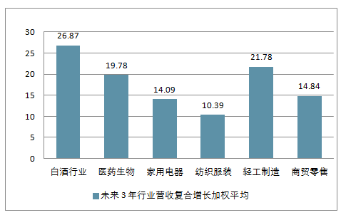 白酒行业未来 3 年加权平均增速为26.87%,在医药生物、家用电器、纺织服装、轻工制造、零售商贸几个行业中排名首位。