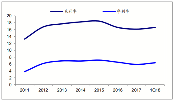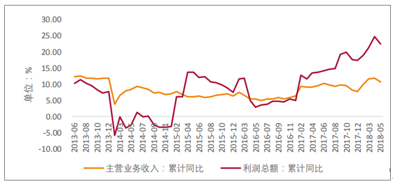 酒、饮料类自 2017 年以来一直保持增长,进入 2018Q2,利润总额累计同比增长仍维持在 20%以上,远高于主营业务收入增速,毛利率有所提高,盈利能力增强