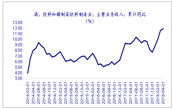 首先,从目前的主营业务收入数据来看,酒、饮料类在消费四大行业里面恢复较快,到2018Q2 累计同比达到 10.8%,只低于医药制造行业。