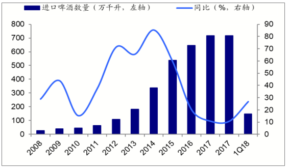 十多年来首次出现负增长;2015年-5.06%;2016年-0.1%。2)进口啤酒抢占高端。2012-2016年每年进口量CAGR增速42%。3)并购少,新建少,关停多.
