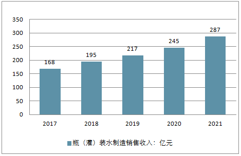 2017-2021年中国瓶(灌)装水制造行业销售收入走势