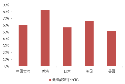 我国低温酸奶市场经过多年发展,竞争格局相对稳定,竞争小幅加剧。全国性乳企蒙牛、伊利、光明占据国内六成市场,2015年1-9 月低温酸奶市场CR3 约60%,略高于日本和英国,低于香港和美国。15年由于整个乳品业景气度下降、市场竞争加剧,加之低温酸奶保质期短,进入流通渠道(主要是商超、便利店等)后需及时售出,商家加大了买赠、促销力度,减少节目赞助等花费较高的开支,整体市场增速高于巴氏奶,低于常温酸奶。