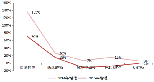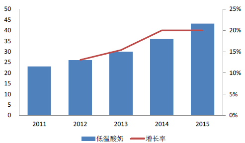 自2011年以来,低温酸奶销售额增速较快,2014年达到26%,其余年份增速均在11%-15%之间,2011-2015年CAGR 约15.7%。2015年中国乳业经历寒冬,在经济下滑、消费动力不足、行业竞争加剧的三重压力下,各类乳制品增速较13、14年均有下滑,其中巴氏奶、UHT 奶和含乳饮料增速为负。根据中粮营养健康研究院的统计数据,低温酸奶2015年增速15%,高于液态奶5%的行业平均增速,成为仅次于常温酸奶的明星产品。根据AC 尼尔森统计, 2015年低温酸奶市场规模约250 亿。据预测,受益于冷链完善,给定15% 的年均复合增速,2020年低温酸奶整体市场规模可突破500 亿。