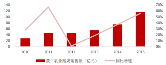自2012年以来,受益于蒙牛纯甄常温酸奶的快速增长,蒙牛乳业酸奶业务销售额增速不断加快,15年酸奶大类增速达55.48%。剔除蒙牛常温酸奶纯甄的销售额部分,估算蒙牛低温酸奶产品2015年销售额约90 亿,同比增长超30%,2010年-2015年年均复合增长率26%,考虑到蒙牛当前的霸主地位及产品不断推陈出新,虽近两年销售遇到瓶颈,但未来增长可期。