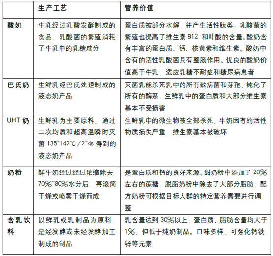 酸奶是牛乳经过乳酸发酵制成的食品,乳酸菌的繁殖消耗了牛乳中的乳糖成分。酸奶中含有丰富的蛋白质、钙、核黄素和维生素等。按照制作工艺的不同,可以分为低温酸奶(“活菌型酸奶”)与常温酸奶(“灭菌型酸奶”)。根据《中国食物与营养》报告,低温酸奶的营养价值位于乳饮的顶端,每单位蛋白质含量高于其他品类的乳饮。由于常温酸奶延长了产品保质期,在热处理过程中杀灭了活性乳酸菌,而乳酸菌对促进人体肠胃功能、改善消化方面具有重要作用,因此常温酸奶在改善消化方面比起低温酸奶略逊一筹。