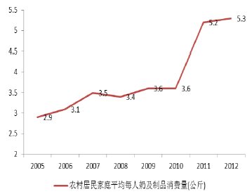 2012年,高收入家庭的人均奶制品消费支出是困难户的近4 倍。随着居民人均收入的提升,农村家庭奶制品消费量增长迅速,从2005年的2.9kg 上升至2012年的5.3kg。未来随着城镇居民和农村居民收入水平的进一步提升,乳品消费量仍有较大增幅。