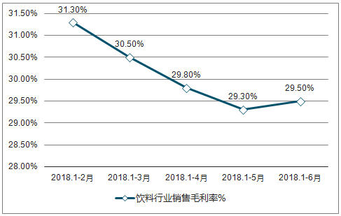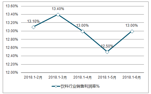 2018年1-6月,我国饮料行业盈利能力基本稳定,行业销售毛利率为29.5%,与上月相比 增长0.2个百分点。饮料行业销售利润率为13.0% 与上月销售利润率增长0.5%