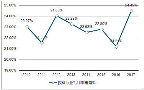 2012年我国饮料行业的毛利率为24.05%,为近7年最高毛利率;2012年后逐渐下降。到2016年下降到21.21%,为近7年来最低毛利率;2017年我国饮料行业毛利率为24.49%,较上年上升3.28个百分点。