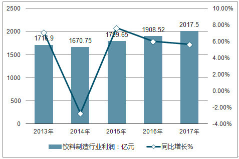 2017年规模以上饮料制造业实现利润总额2017.5亿元,同比增长5.71%。