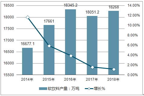 从2014年开始中国饮料增速下跌至10%以下,并一直保持下滑趋势,2017年甚至是变为负增长。2017年中国饮料产量为18051.2万吨,同比下滑1.6%%,预计到2018年中国软饮料累计产量将达18268万吨。
