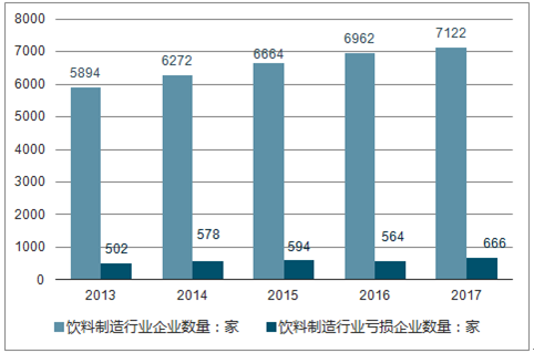 2013-2017年中国饮料制造行业企业数量及亏损企业数量走势