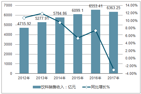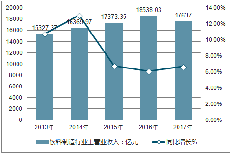 2017年我国规模以上饮料制造业主营业务收入达17637亿元,同比下降4.86%。