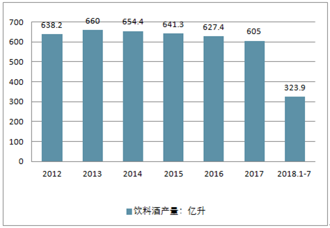 2018年1-7月,饮料酒产量达323.9亿升,同比增长0.76%。其中白酒产量540.71万千升,同比增长3.32%;啤酒产量2512.09万千升,同比增长0.49%;葡萄酒产量39.61万千升,同比下降1.72%。