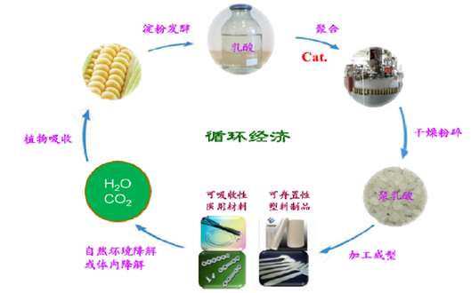 聚乳酸为可生物降解材料,降解的最终产物是二氧化碳和水,分解的中间产物乳酸对人体无害,且其生产所使用的原料为可再生资源,因此在美国、日本和欧洲等国引起广泛关注和支持,并已较大规模投产与投放市场。