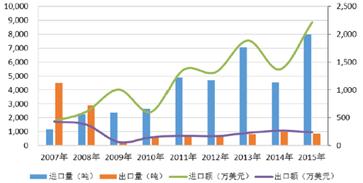 根据甄光明教授在《乳酸及聚乳酸的工业发展及市场前景》中的数据,2014年全球聚乳酸市场需求量约为11-12万吨,预计未来将以20%-30%的速度增长,至2020年聚乳酸市场将达到30-50万吨。目前,PLA的主要消费领域是包装材料,占总消费量的65%左右;其次为生物医学领域,约占总消费量的26%。欧洲和北美是PLA最大的市场,而亚太地区是增长最快的市场之一。日本、印度、中国和泰国对PLA的需求还会持续增长,从而推动PLA在亚太市场的增长。2007年以来,我国聚乳酸的进口数量在国内需求的推动下不断攀升,2010-2015年聚乳酸进口量年平均增长率达34.22%,2015年进口金额再创新高,达2,213.28万美元。随着国内聚乳酸共混改性及成型加工技术的发展,其机械和耐热耐久性能得到进一步提高,促使我国的聚乳酸能够进军性能更加卓越的高端市场,出口价格也在逐渐上升并与进口价格基本持平。