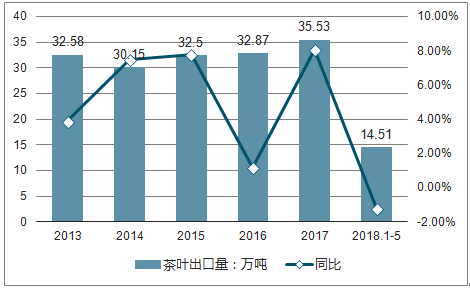 2018年1-5月,我国茶叶出口数量为14.51万吨,同比下滑1.2%。2013-2017年我国茶叶出口在2014年最低为30.15万吨,同比下滑7.5%;2017年为最高值达35.53万吨,涨幅达8.1%。