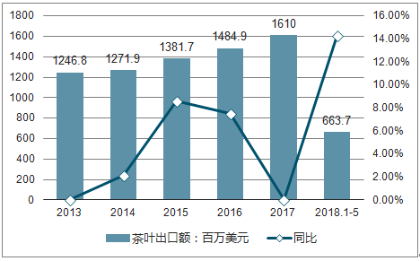 2018年1-5月,我国茶叶出口金额为663.7百万美元,同比增长14.3%。,2013-2017年我国茶叶进口金额在2013年最低为1246.8百万美元,同比增长19.6%;2017年为最高值达1610百万美元,同比增长8.4%。
