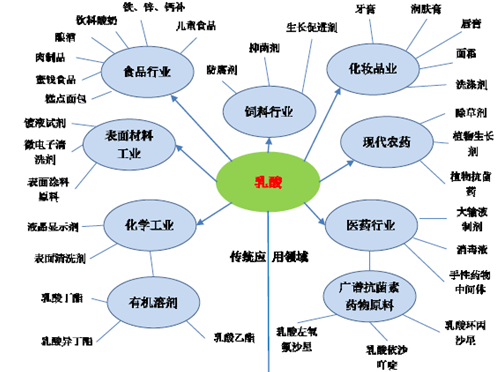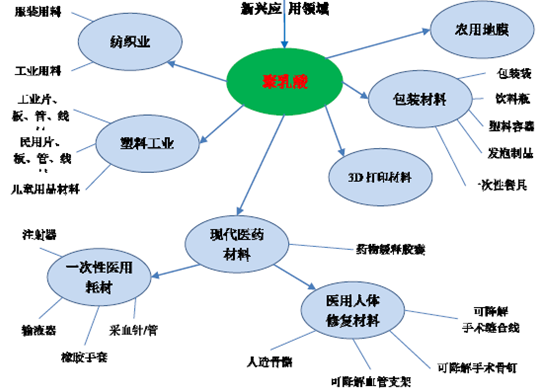 作为一种历史悠久且重要的有机酸,乳酸及其盐类等衍生物目前已广泛应用于食品、医药、饲料、化工等传统应用领域;而乳酸通过缩聚反应生成的聚乳酸作为近些年出现的一种环保绿色的新型生物基可降解材料,在纺织、塑料、包装、农用地膜、现代医药、3D打印等新兴应用领域具有广阔的应用前景。乳酸及聚乳酸的主要应用领域如下图所示: