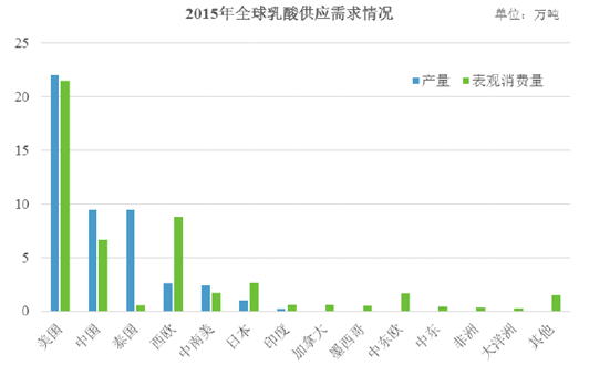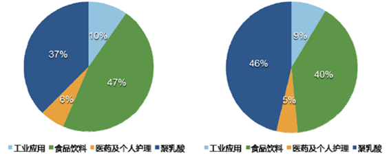目前乳酸的下游应用中,用于食品饮料领域的乳酸在2015年占整体市场的46.6%,其次为应用于聚乳酸市场占比约为37.5%。预计未来几年,随着聚乳酸市场需求快速增长,聚乳酸将超过食品和饮料行业成为乳酸的第一大应用领域。