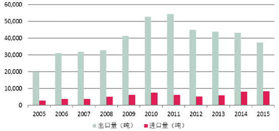 2005-2015年我国乳酸及其盐和酯出口和进口量