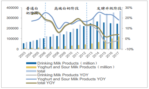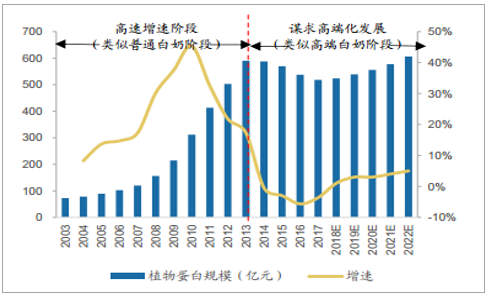 参考动物蛋白行业,高端化为植物蛋白主要发展方向。 动物蛋白饮料行业主要经过了四个阶段: 1、 低端纸装膜牛奶; 2、 利乐袋、利乐枕、利乐砖等普通白奶;3、 普通白奶升级到高端白奶,以特仑苏、金典为代表; 4、 发酵升级成常温酸奶、低温酸奶,乳酸菌饮品等。相较动物蛋白饮料,植物蛋白饮料行业升级过程缓慢,目前处于动物蛋白饮料的第二轮阶段,升级方向朝着动物蛋白第三轮高端产品、第四轮发酵产品进行。2014年开始植物蛋白饮料行业规模出现下滑,推动行业升级转型。参考动物蛋白行业增长三四阶段增速超过10%, 17年植物蛋白饮料降幅从-5.63%收窄至-3.63%,未来几年内虽难以达到动物蛋白第三阶段的水平, 但我们预计植物蛋白行业高端化将推动植物蛋白饮料行业恢复正增长。
