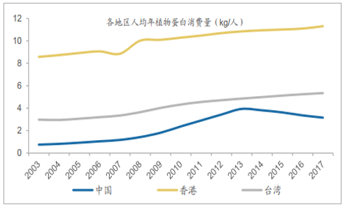 中国植物蛋白饮料人均消费量低,对比发达市场仍有提升空间。中国目前植物蛋白饮料的人均年消费量只有3.2kg, 对比台湾地区的5.3kg和香港地区的11.3kg仍存在发展空间。 香港台湾地区有较好的植物蛋白饮料消费习惯,且植物蛋白饮料绿色营养健康的形象受到不少素食主义者的青睐。我们认为随着国内人民健康意识提升,生活条件改善后对植物蛋白的需求会进一步提升,我国植物蛋白饮料人均消费量存在提升空间。