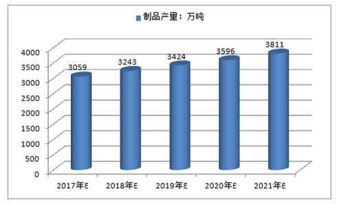 预计2017年我国乳制品产量将达到3,059万吨,未来五年(2017-2021)年均复合增长率约为5.65%,2021年产量将达到3,811万吨。