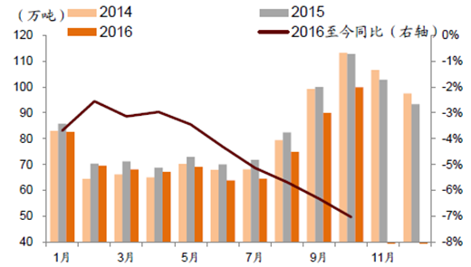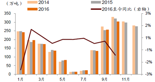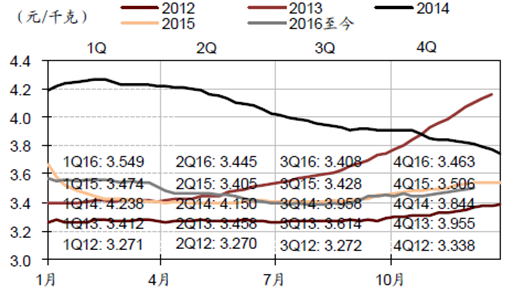 全球主要产区当前均处于减产周期,其中2016 年新西兰原奶产量同比下跌1.0~2.0%,澳大利亚原奶产量同比下跌7.0~9.0%,且近月减产力度均较大。我们认为全球原奶供需调整到位仍需时日,但主产国减产有助于加速全球供需关系再平衡。同时,前期为消化库存,原奶主产国加大对中国出口。因我国奶价相比进口大包粉不具备价格优势,且部分产品对进口粉存在口感依赖,使得进口粉对国内生鲜乳消费形成挤占。但伴随国际奶价回升,当前新西兰全脂奶粉到岸完税价与国内规模牧场3.7~3.8 元/千克的原奶收购价已较为接近;后市若海外大包粉价格续涨,进口粉价格优势消失,也将推升下游乳企对国内生鲜乳的需求。