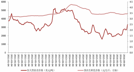 国内生鲜乳价格滞后于恒天然拍卖价格3-6个月