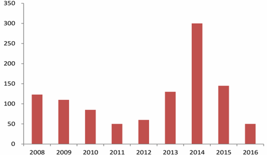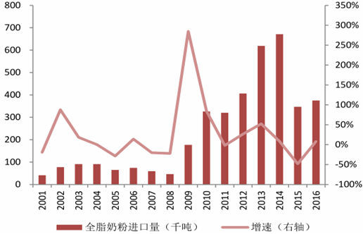 中国全脂奶粉进口量2015年大幅下滑,仅为35万吨,同比下降48%;2016年略有回升,全脂奶粉进口量将近40万吨,同比+8%。