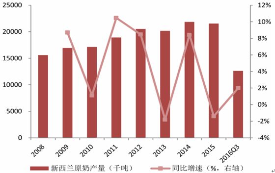 2015年新西兰原奶产量2153万吨,同比-1.42%;2016年前三季度新西兰原奶产量1260万吨,同比+0.18%。2015年以来新西兰奶农出现大面积亏损,非正常屠宰频现,原奶产量下降。