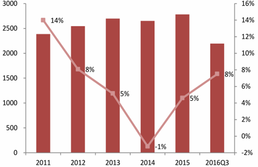 乳制品在经过高速增长阶段之后逐步回归正常增速,近几年乳制品产销量增速基本是个位数增长, 2016年前三季度乳制品产量同比+8% ,2016年上半年乳制品销量增长7%,未来乳制品下游需求仍将保持个位数稳定增长。