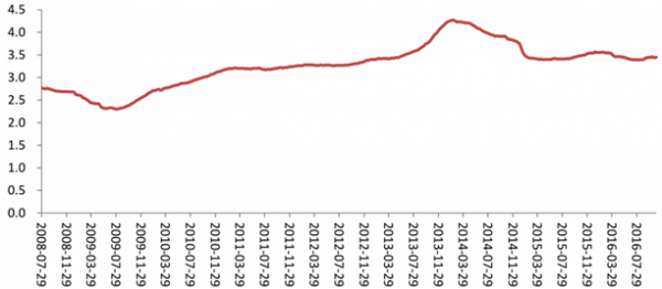 我国生鲜乳价格在经过2009-2013年暴涨之后,从2014年初开始逐步下降。截至目前,主产区生鲜乳平均价为3.45元/公斤,较最高点4.27元/公斤跌幅超过20%,2016年呈现筑底企稳状态,随着需求端稳健增长、供给端加快去产能和产业政策推出,原奶价格有望筑底回升。