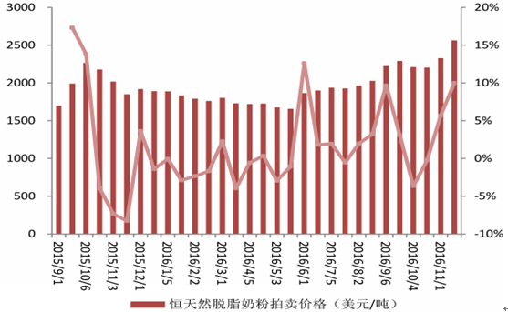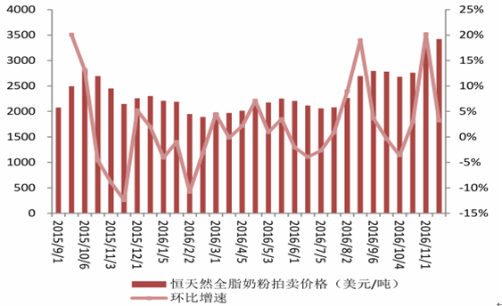 恒天然拍卖价格自2016年6月初开始上涨,截止最新一次11月15日,全脂奶粉和脱脂奶粉拍卖价格分别达到3423美元/吨、2562美元/吨,较2016年5月份分别上涨52%、55%。