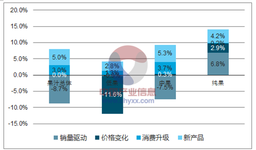 目前来看,纯果占果汁市场比例最小,但是其营养价值最高,毛利率最高,均价最高。受益于消费升级及大众健康意识的觉醒,纯果市场展现出量价齐升的趋势。 2016 年,纯果均价上涨 4.1%,销量上涨 9.8%,总销售额上涨 14.3%。根据尼尔森的统计,对比低果、中果及纯果销售额驱动因素的变化,可以明显看出纯果是果汁市场的发展方向。