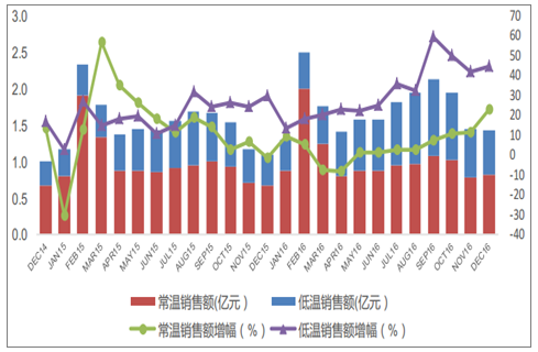 纯果区分低温与常温后看,低温增长快于常温,但是占比较低,大约 40%。低温主要是由牛奶扩展的,有了牛奶之后果汁才可以用同样渠道铺开冷链果汁。现在来看低温受到渠道的限制,在一、二线城市发展比较快,在三、四线以及乡镇因为没有全程低温供应链就很难达到。这个情况随着整体供应链的完善,低温果汁受到的限制会越来越少。对于常温果汁来说,它没有任何限制,无论在乡镇还是在一线城市都可以进行铺货。