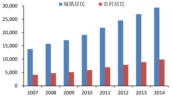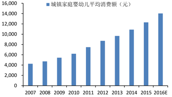 近年来我国居民收入稳步提高,2014年居民可支配收入为20,167元,同比上升10.1%,其中城镇居民 2014 年可支配收入为 29,381 元,同比上升 9.0%,农村居民 2014 年可支配收入 9,892 元,同比上升 11.2%,带动婴幼儿消费提高。城镇婴幼儿是奶粉市场的重要参与者,其人均消费在增加,据统计,我国城镇家庭的婴幼儿人均消费额由 2007 年的 4,260 元增加至 2015 年的 12,308 元,增长约 2 倍,预计 2016 年达到 14,034元。