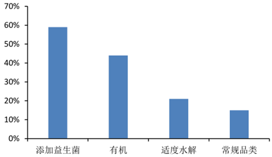 另外,中国妈妈对婴幼儿健康非常重视,对进口奶粉、高端奶粉的购买意愿更加强烈,据调查发现,84.8%的消费者追求高端品质的奶粉产品,添加益生菌的奶粉与有机奶粉更受青睐,相应推升了高端奶粉的市场规模。