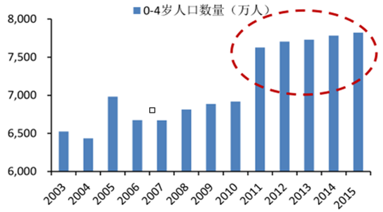 0~4 岁婴幼儿是奶粉的主要使用者,2011 年起我国 0-4 岁婴幼儿数量骤然上升,比2010 年增加约 707 万人,同比增长 10.2%,截至 14 年末,我国 0~4 岁婴幼儿共 7,783 万人,预计 15 年为 7,822 万人以上。受单独二孩与全面二孩政策的影响、以及 1986-1990年的婴儿潮人口逐步进入生育期,未来三年 0~4 岁婴幼儿规模将进一步扩大。根据国家卫计委,我国 2016 年出生人口将超过 1,750 万人,大致相当于 2000 年前后的新生儿规模,二胎政策红利将在 17 年逐渐释放。