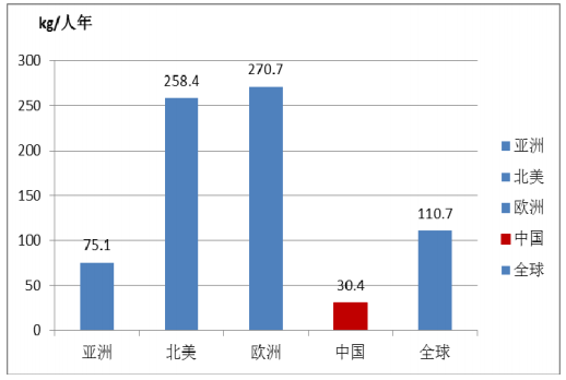 上述四个奶业贸易国家(地区)2015 年原料奶产量合计增长了 570.2 万吨,较上年有较大幅度的下跌,同时国际乳制品需求大幅下滑,尤其是中国的进口需求减弱和俄罗斯对欧盟等国(地区)实施乳制品的禁运,以及国际原油价格暴跌而造成的石油出口国购买力下降等因素,导致了国际乳制品市场价格低迷。中国2015 年的乳制品消费在整个经济增速减缓的大背景下也出现了一定的停滞,进口的增长、尤其是大包原料奶粉由于国内库存的高企也出现了大幅度的下跌。但我国的人均乳制品消费依然很低,2015 年仅为 30.4 千克,不足亚洲平均水平的二分之一、全球平均水平的三分之一,市场潜力巨大,而国内供给长期看无法满足市场需求,中国对国际市场的需求也会随着消费的恢复而持续增长。