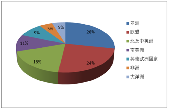全球奶类生产有明显的区域性。就牛奶生产而言: 2014 年亚洲牛奶产量 1.86亿吨,比 2013 年增长 3.9%,占全球牛奶市场的 28.1%;欧盟 28 国牛奶产量 1.60亿吨,增长 4.0%,占比 24.1%;北美及中美洲牛奶产量 1.19 亿吨,增长 2.1%;占比 17.9%;南美洲牛奶产量 0.73 亿吨,增长 2.7%,占比 10.9%;欧洲 28 国外的其他欧洲国家牛奶产量 0.58 亿吨,增长 0.6%,占比 8.7%;非洲牛奶产量 0.35亿吨,增长 3.7%, 占比 8.7%; 大洋洲牛奶产量 0.32 亿吨,增长 6.05%, 占比 4.8%。
