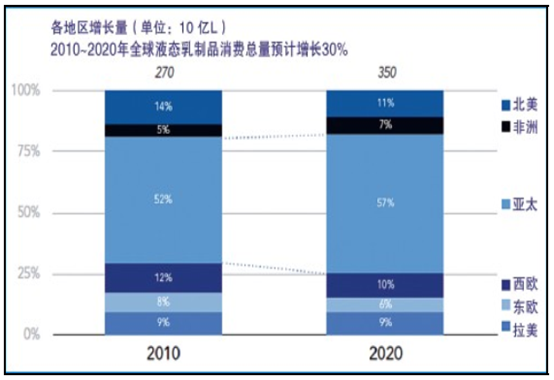 由于经济发展,城市化加速以及亚洲中产阶级购买力增强,未来 10 年全球牛奶消费将大幅增长。预计全球液态乳制品的需求总量将从 2010 年的约 2,700 亿升增加到 2020 年的约 3,500 亿升。
