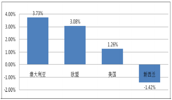 在目前全球奶业贸易中,主要的出口国家(地区)有新西兰、澳大利亚、欧盟和美国,这四个国家(地区)都与中国有着密切的贸易往来。2015 年,这四个国家(地区)的原料奶产量(加工量)有涨有跌,美国增长 1.26%,欧盟增长3.03%,澳大利亚增长 3.73%,新西兰下跌 1.42%,合计产量增长为 570.2 万吨,大幅低于 2014 年的 1062.9 万吨。